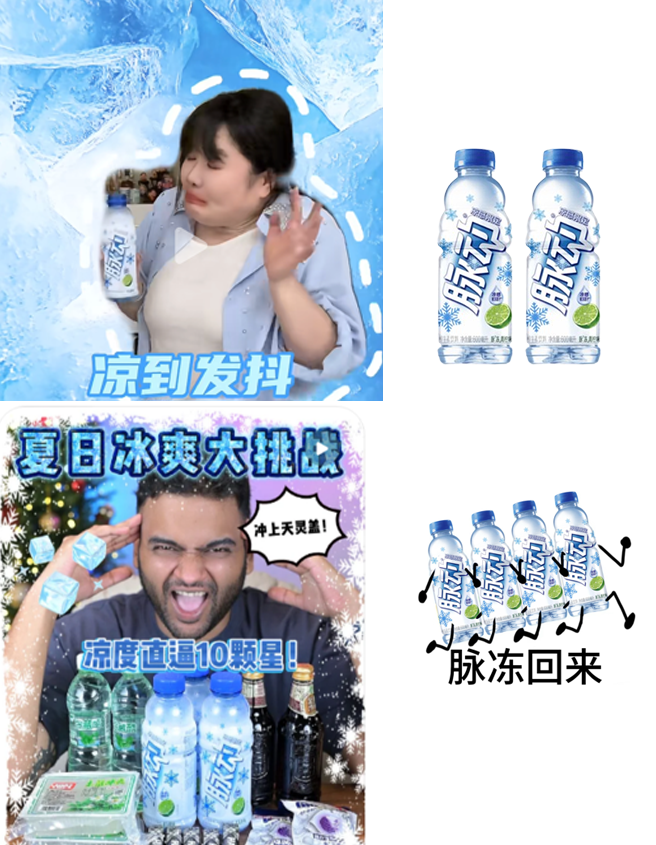 投放策略:定位夏季冷饮消费者搜索需求之首“解暑”→下钻发现“中暑、烦躁”等不良状态→聚焦需要找回状态的高频场景。通过视觉化清凉体验+突显前后反差,多角度玩味体现「脉动让你状态回来」。