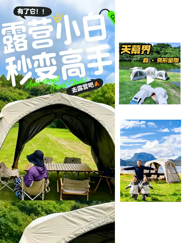 项目背景:天幕赛道关联多品类关键词,游戏联名/高达模型/汽车天幕等,并未有任何户外天幕品牌占领赛道。品类需求呈下降趋势,品类卖点雷同,变相增加了品牌的推广成本,百万以内的推广预算体量偏小。不仅要打爆品,还要拓展新人群新场景,还要助力电商转化。
