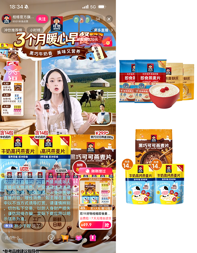 基于抖音“FACT+S”内容+货架双场共振飞轮方法论,茉莉数科集团独家提炼了“双轮三爆模型”,以“打造爆款”、“爆量跃升”、“批量爆量”为主要营销策略,代运营品牌主桂格旗下的3大直播间:@桂格官方旗舰店、@桂格官方旗舰店优选号、@桂格官方旗舰店即食直播间。